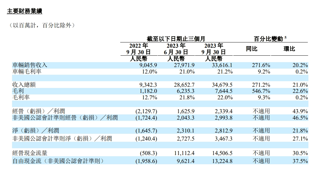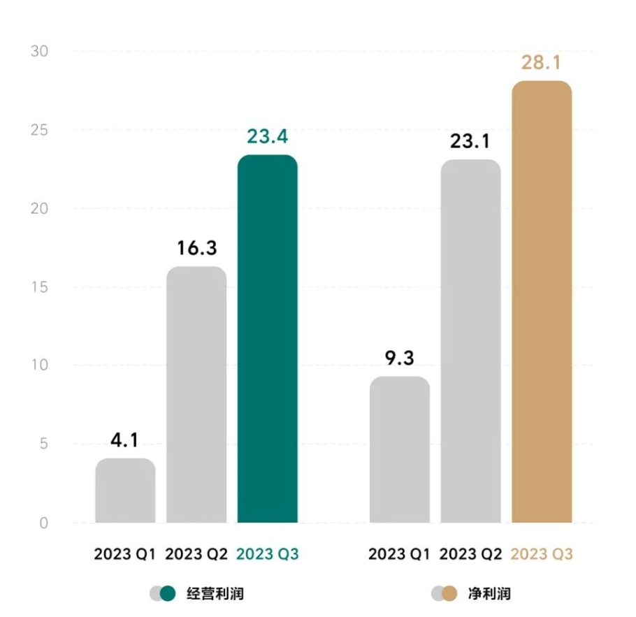 利润方面,第三季度理想经营利润为23.4亿元,而去年同期理想还面临着21.3亿元的经营亏损,这个数据相比上个季度的16.3亿元也增加了43.9%。