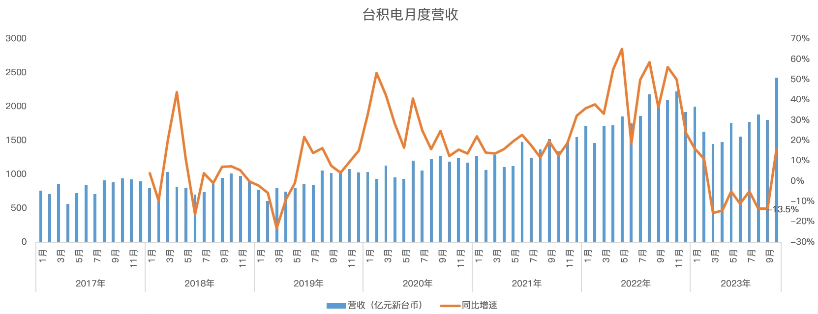 上周五,芯片代工之王台积电发布了10月销售数据,以新台币计算,当月营收2432亿,创历史记录!同比增长15.6%: