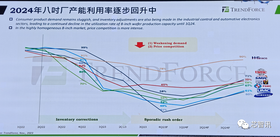另外,随着明年市场的逐步回暖以及晶圆代工厂对于成熟制程的降价策略,集邦咨询预计2024年8吋晶圆代工的产能利用率将会持续攀升,到2024年底,大多数的晶圆代工厂的8吋产能利用率都将达到60%以上(提升5到10个百分点),台积电和中芯国际将达到70%以上,华虹将达到90%。