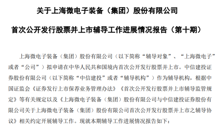 11月2日,中信建投披露关于上海微电子装备(集团)股份有限公司首次公开发行股票并上市辅导工作进展情况报告(第十期),指出上海微电子装备(集团)股份有限公司(简称“上海微电子”)拟申请在中华人民共和国境内首次公开发行股票并上市。中信建投作为辅导机构。