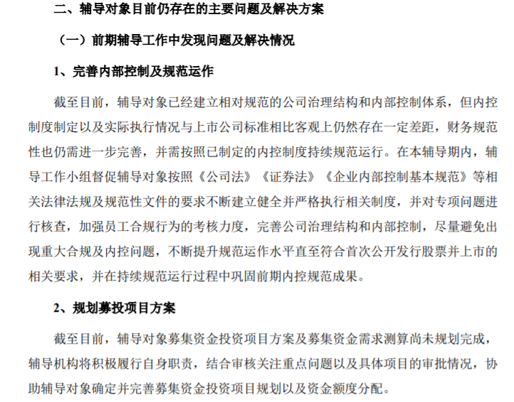 关于下一阶段辅导工作,报告称针对辅导中的不规范之处及仍存在的问题,与公司及其他中介机构研究协商,确定下一阶段的整改方案,并指导公司加以落实,并对落实情况进行密切跟踪检查。