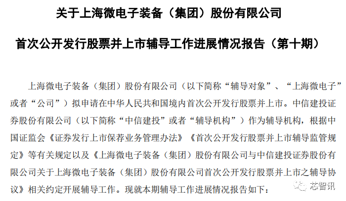 近日,中信建投披露关于上海微电子装备(集团)股份有限公司(以下简称“上海微电子”)首次公开发行股票并上市辅导工作进展情况报告(第十期),指出上海微电子装备(集团)股份有限公司(简称“上海微电子”)拟申请在中华人民共和国境内首次公开发行股票并上市。中信建投作为辅导机构。