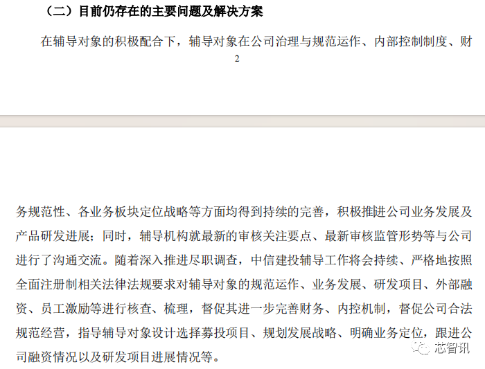 在上市辅导工作进展情况报告中,中信建投指出了辅导对象目前仍存在的主要问题及解决方案,包括前期辅导工作中发现问题及解决情况、目前仍存在的主要问题及解决方案。比如,截至目前,辅导对象募集资金投资项目方案及募集资金需求测算尚未规划完成。