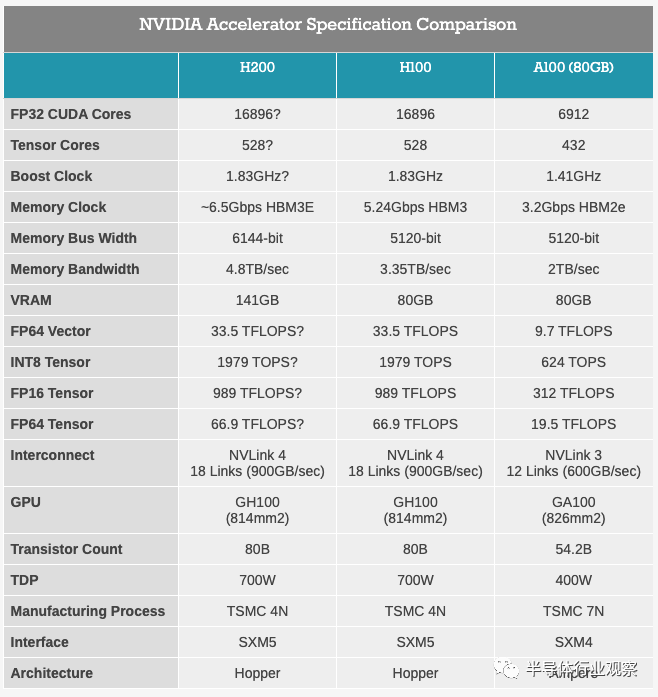 不过据anadtech分析,H200 迄今为止仅适用于 SXM5 插槽,并且在矢量和矩阵数学方面具有与 Hopper H100 加速器完全相同的峰值性能统计数据。区别在于,H100 具有 80 GB 和 96 GB 的 HBM3 内存,在初始设备中分别提供 3.35 TB/秒和 3.9 TB/秒的带宽,而 H200 具有 141 GB 更快的 HBM3e 内存,带宽为 4.8总带宽 TB/秒。