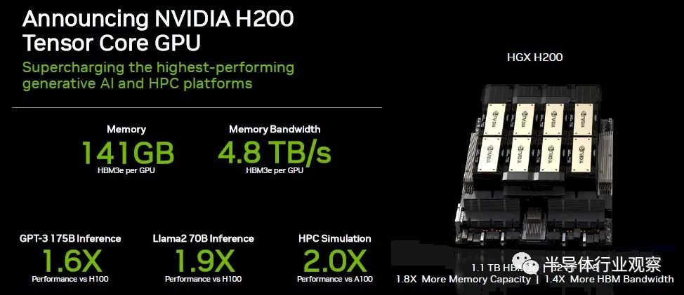 英伟达指出,NVIDIA H200 是首款提供 HBM3e 的 GPU,作为一种更快、更大的内存,HBM3e可加速生成式 AI 和大型语言模型,同时能推进 HPC 工作负载的科学计算。借助 HBM3e,NVIDIA H200 能以每秒 4.8 TB 的速度提供 141GB 内存,与前前一代的NVIDIA A100 相比,容量几乎翻倍,带宽增加 2.4 倍。