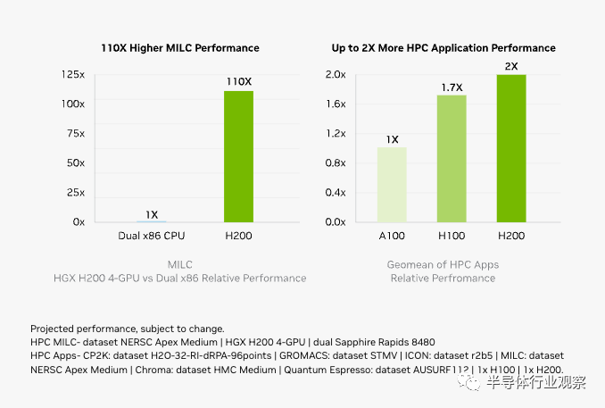 英伟达进一步指出,内存带宽对于 HPC 应用程序至关重要,因为它可以实现更快的数据传输,减少复杂的处理瓶颈。对于模拟、科学研究和人工智能等内存密集型 HPC 应用,H200 更高的内存带宽可确保高效地访问和操作数据,与 CPU 相比,获得结果的时间最多可加快 110 倍。