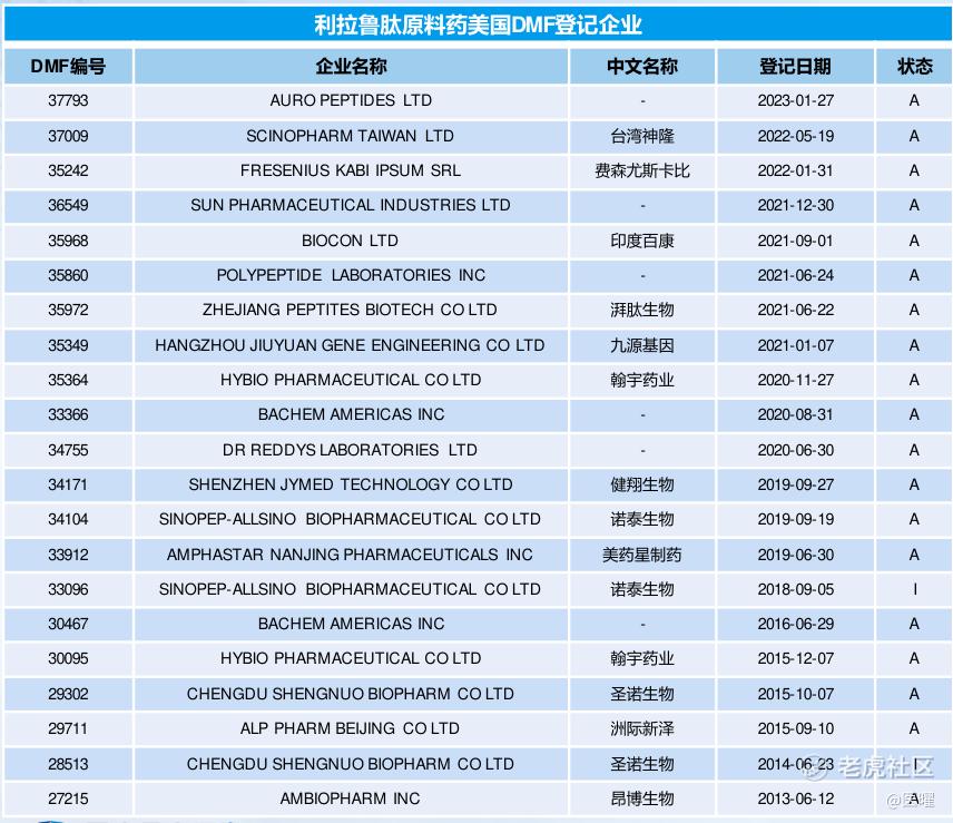 国内企业目前共有五家,分别为天马医药、健元医药、诺泰生物、湃肽生物和翰宇药业,需要注意的是翰宇是近期批复的,所以图中资料并未统计在内。我们直接通过FDA的DMF注册表格查询可以看到“HYBIO PHARMACEUTICAL CO LTD(翰宇药业)”目前状态为A。