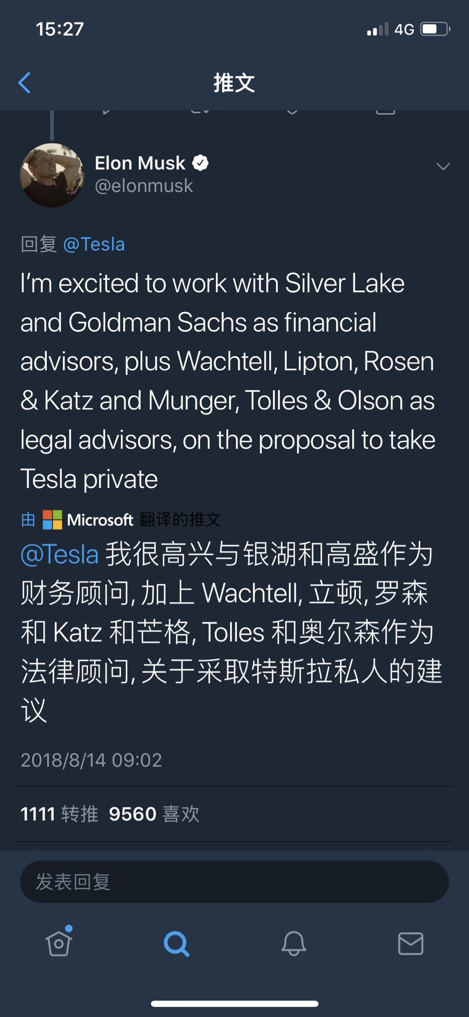 I’m excited to work with Silver Lake and Goldman Sachs as financial advisors, plus Wachtell, Lipton, Rosen & Katz and Munger, Tolles & Olson as legal advisors, on the proposal to take Tesla private