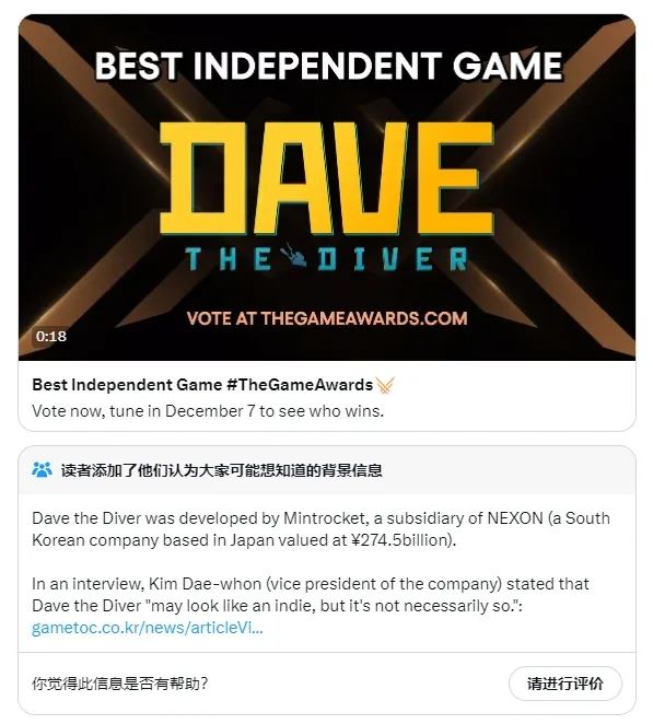 而不得不提及的是,《潜水员戴夫》此次入围最佳独立游戏奖项后引发了争议。由于开发商Mintrocket事实上是韩国巨头Nexon下属的子公司,不少玩家认为《潜水员戴夫》不应被归类进独立游戏之中。TGA的官方推文甚至被推特上用户打上了背景信息标识,澄清Mintrocket背后的资本关系。