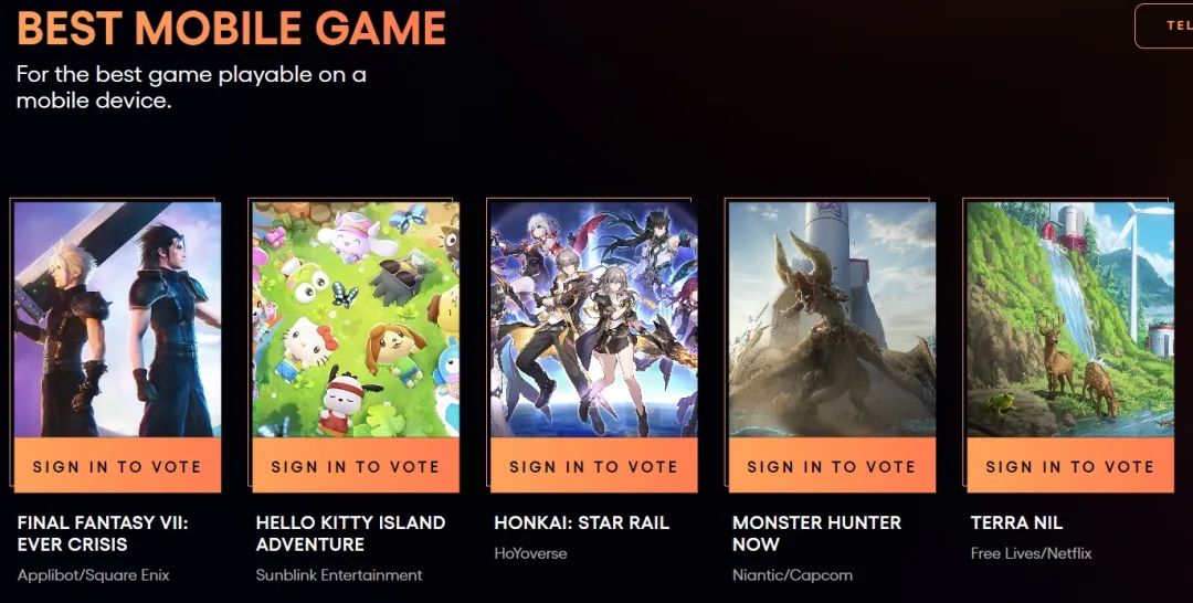 本届TGA大奖中也出现了不少中国厂商的身影。二次元游戏龙头米哈游在本届TGA中收获两项提名,其中《崩坏:星穹铁道》入选最佳移动游戏,进入4.2版本后再创新高的《原神》同时斩获了最佳持续运营奖项提名。