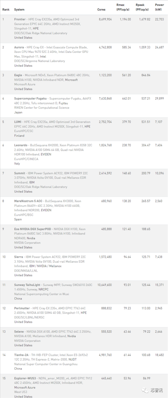排名第三的是安装于微软美国Azure云中的Eagle,HPL性能为561.2 PFlop/s,这也是云服务厂商取得的最高排名。其基于英特尔至强铂金8480C处理器和英伟达H100打造。