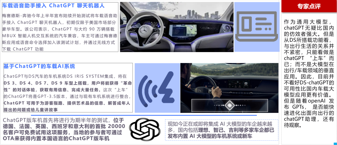 10月19日,法国汽车公司DS宣布,旗下车型已开始搭载基于ChatGPT的AI系统。ChatGPT集成增强了DS车型的驾驶体验,并为其法式艺术风格赋予了更高科技维度和无限潜力,于成为旅行体验的数字助理,聊天机器人得以上升到一个全新的维度。
