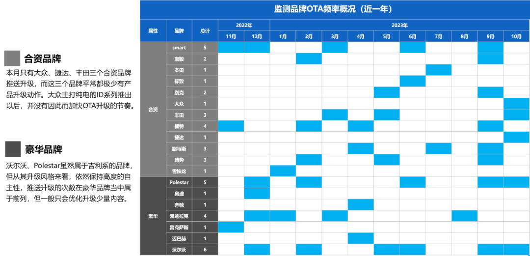 本月更新的合资&豪华品牌不少,但实际的内容并不多,仅丰田推送了较多优化内容。丰田、大众、捷达到目前为止极少推送OTA升级。