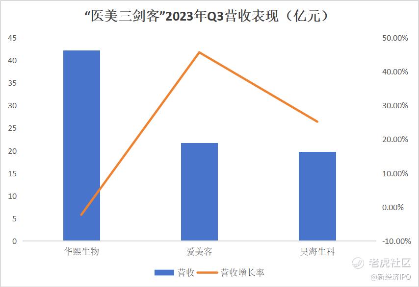 财报显示,2023年前三季度,华熙生物、爱美客、昊海生科的营收分别为42.21亿元、21.70亿元、19.82亿元;营收增长率分别为-2.29%、45.71%、25.23%。