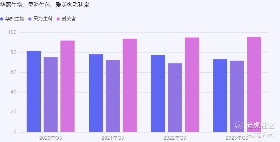 毛利润方面,2020年-2023年前三季度华熙生物毛利率分别为81.41%、78.07%、76.99%、73.07%;同期,昊海生科的毛利率为74.93%、72.10%、68.98%、71.65%;爱美客的毛利率为91.81%、93.70%、94.85%、95.30%。