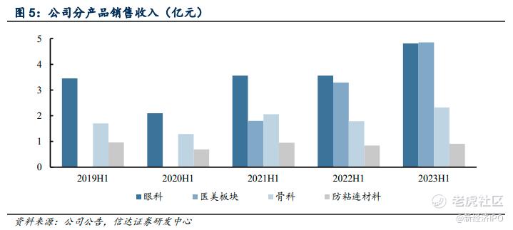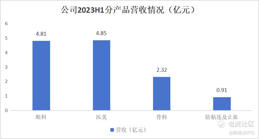 2023年上半年,昊海生科眼科产品实现收入4.81亿元,同比增长34.98%;医美板块营收为4.85亿元,同比增长47.49%,其中玻尿酸收入为2.56亿元,同比增长114.35%;骨科产品营收约为2.32亿元,同比增长29.74%;防粘连及止血产品营收0.91亿元,同比增长7.87%。