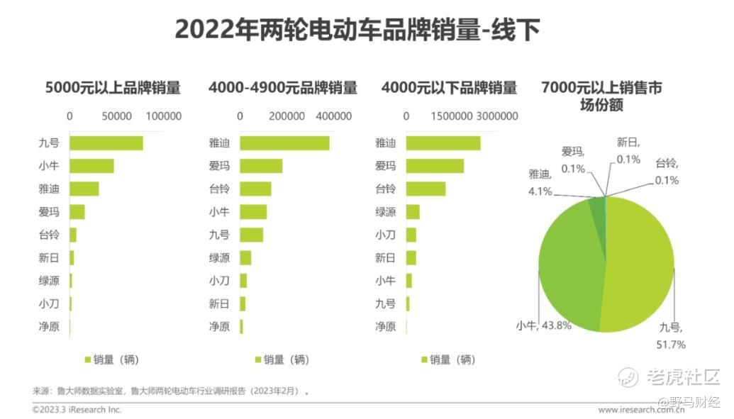 例如,在高端化和智能化认知上,九号公司的产品优于雅迪爱玛两大巨头,但九号公司两轮电动车产品的市占率却落后很多。公开数据显示,2022年中国电动两轮车销量约5010万辆,同期九号公司两轮电动车全年销量为83.16万辆;以此计算,九号公司电动两轮车在国内的市场份额仅占1.66%。