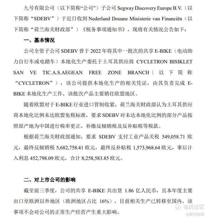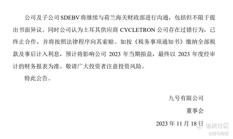 这份公告还称,此次税款补缴涉及的E-BIKE土耳其供应商CYCLETRON,本地化比例未达欧盟免税标准。九号公司表示该事项不会对公司的正常生产经营产生重大影响,已终止与CYCLETRON的合作,并将按照法律程序向其索赔。