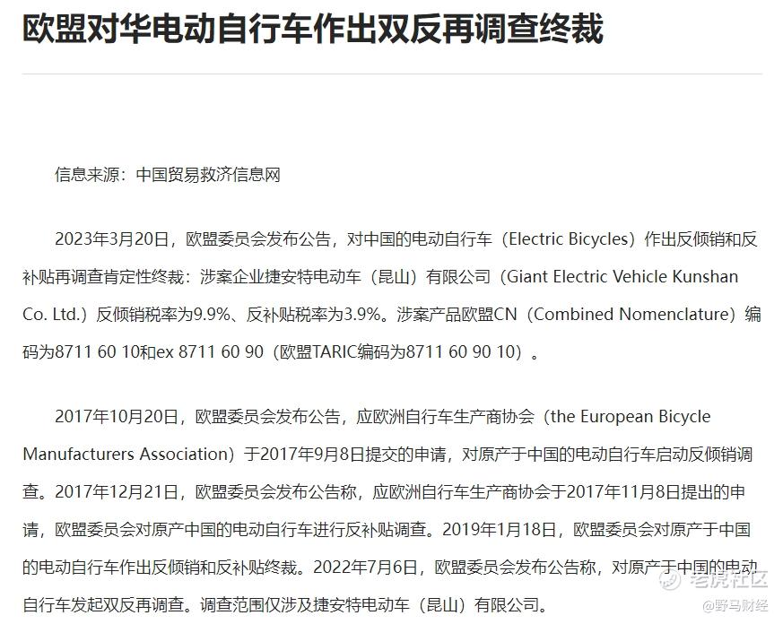 今年3月,另一家中国企业——捷安特电动车(昆山)有限公司,就被欧盟委员会作出反倾销和反补贴再调查肯定性终裁:反倾销税率为9.9%、反补贴税率为3.9%。