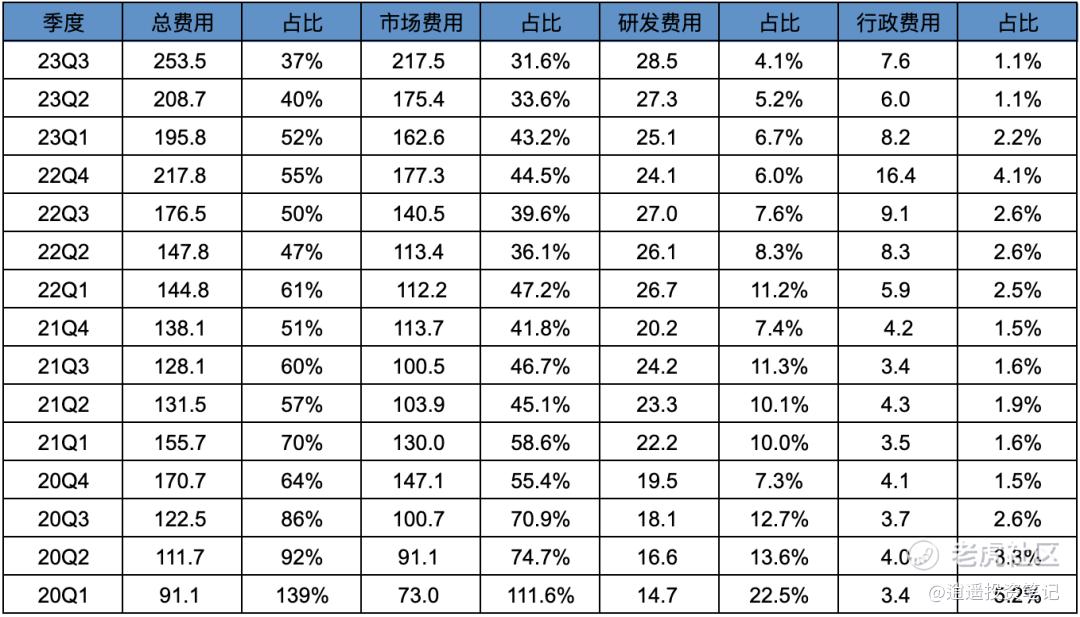 Q3总费用253.5亿,总费用率37%,费用率历史新低;