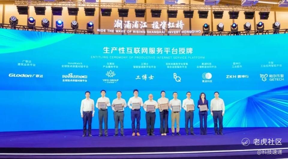 大会现场,由上海市商务委总经济师罗志松、上海虹桥国际中央商务区管委会副主任张斌为商务区生产性互联网服务平台授牌。
