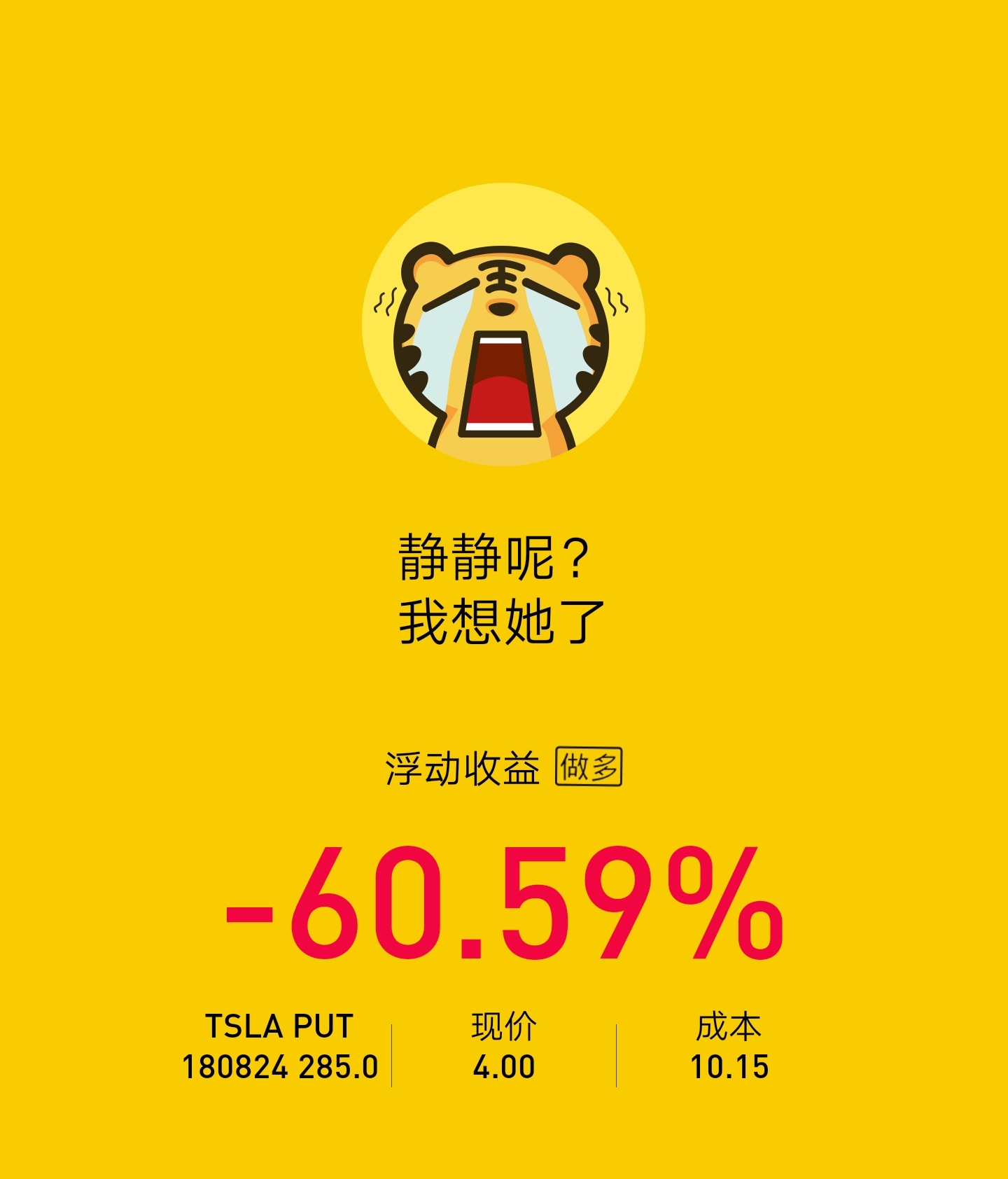 $TSLA 20180824 285.0 PUT(TSLA)$分享下,昨天跌4.5个点买的,让我咋办啊