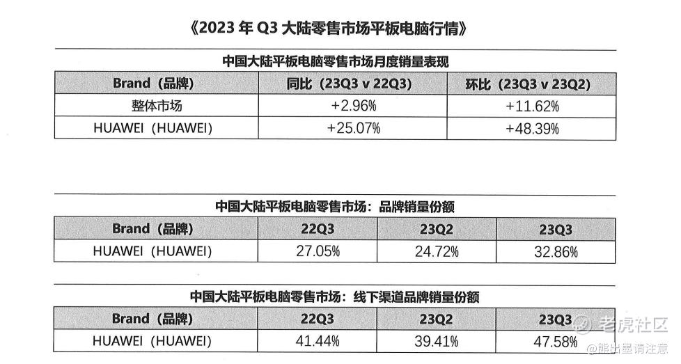 一切都直观地体现在市场数据之上,GfK发布的数据显示,在2023年第三季度中国大陆平板电脑零售市场销量中,华为平板的市场份额高达32.86%。在线下渠道,华为平板市场份额达到47.58%,几乎占据行业半壁江山。