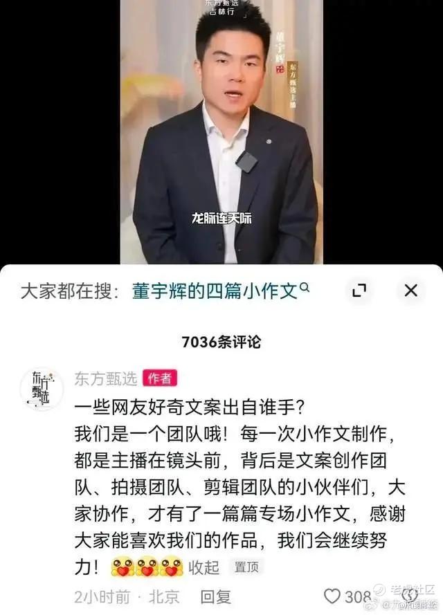 而东方甄选小编在“吉林之行”视频下,置顶了“宣传文案出自谁手”的解答评论,称经典小作文多数由文案团队创作,并非全部出自主播之手。
