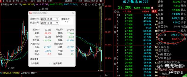 继12月11日大跌之后,12月13日,东方甄选再度重挫12.9%,截止收盘,东方甄选报于27.65元,总市值为276亿港元。