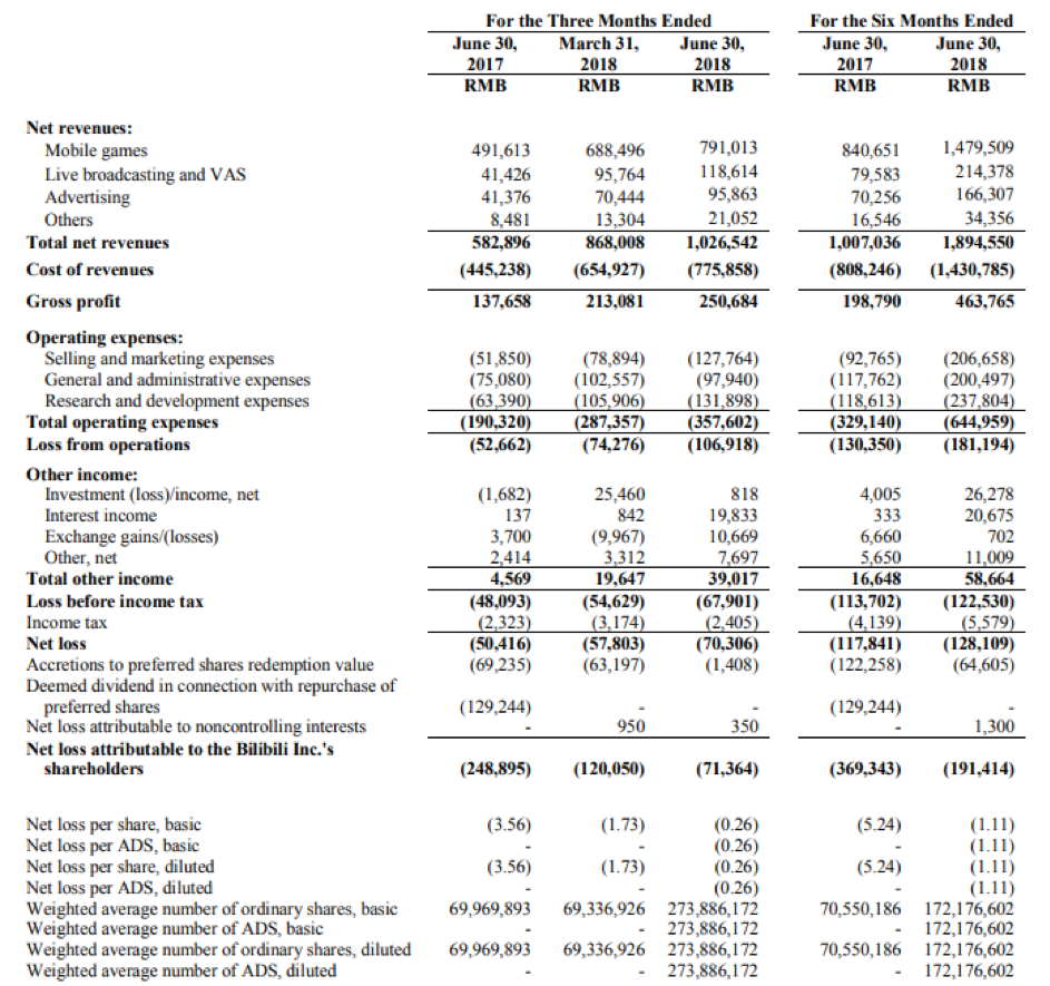 哔哩哔哩$(BILI)$周一发布了2Q18业绩。公司二季度总净营收为人民币10.3亿元(约合1.6亿美元),同比增长76%,环比增长18%;净亏损为人民币7030万元(约合1060万美元),亏损幅度较去年同期的人民币5040万元有所扩大,但净亏损率同比由9%收窄至7%;调整后净亏损人民币1950万元(约合290万美元),亏损率同比由2.3%收窄至1.9%。