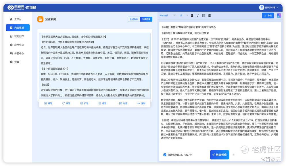 「百家云·市场易」兼顾“易写、易管、易看、易听”四大特点,满足市场部门营销宣传等日常工作所需,提供GPT内容生产、智能管理、传播效果分析、舆情监测四大类服务。智能发布平台作为其中一部分,能够与其他功能联动起来,形成强大的合力,区别于市场上其他自助发稿助手,能够助力企业宣传效果再上一层楼。