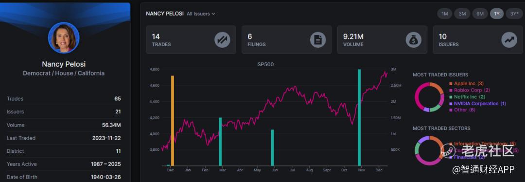 有数据网站盘点了佩洛西近年来的操作纪录,可以看到,除了本次出手英伟达之外,她今年以来还有6项操作。