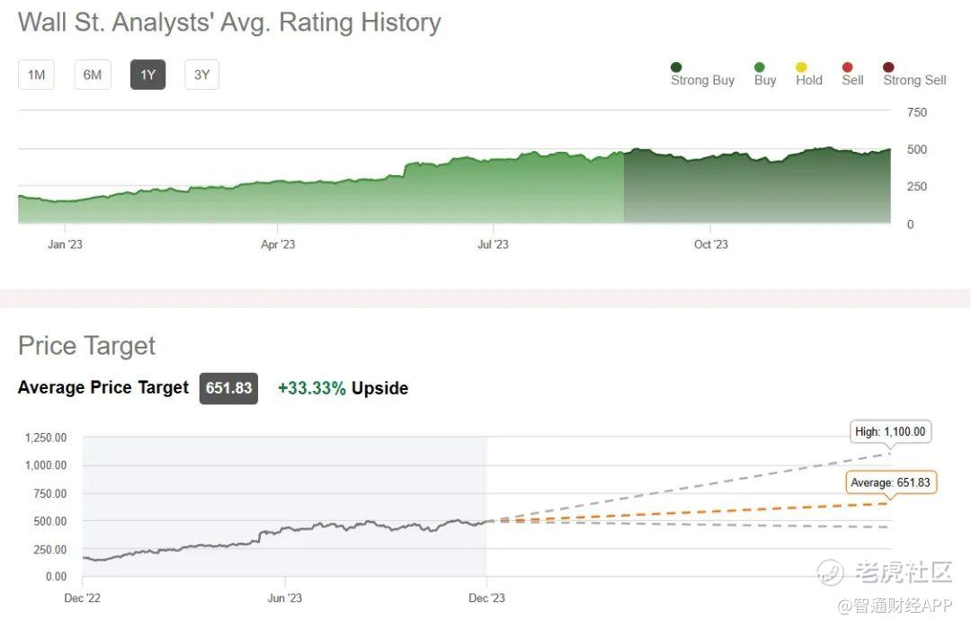 如果考虑到英伟达三位数的增长速度的话,英伟达的本益成长比(Price/Earnings to Growth Ratio,PEG)不到1倍,低于标普500指数的2倍,这表明与其前景相比,英伟达的股价仍然非常便宜。伯恩斯坦分析师Stacy Rasgon对于英伟达股价未来12个月左右的走势极度乐观,该分析师给予英伟达“跑赢大盘”评级,目标价则高达700美元,意味着未来一年潜在涨幅高达43%。