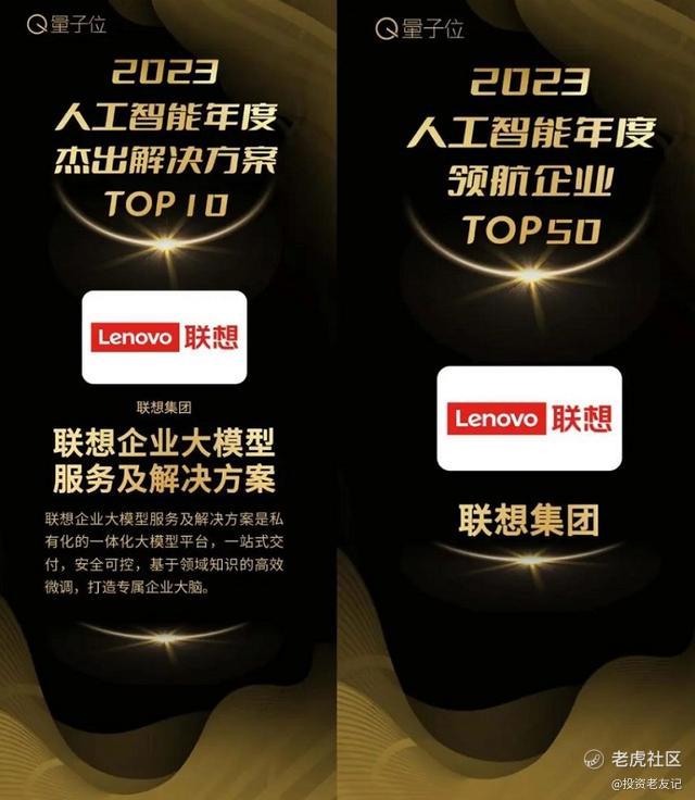 联想方案服务再获业界肯定。近日,国内领先的人工智能与前沿科技领域的产业服务平台量子位公布了2023人工智能产业优秀的产品、方案、企业等评选结果。联想凭借优异表现揽获“双料大奖”。其中,联想大模型解决方案及服务获评“2023人工智能年度杰出解决方案TOP 10”,同时联想集团入选“2023人工智能年度领航企业TOP50”。