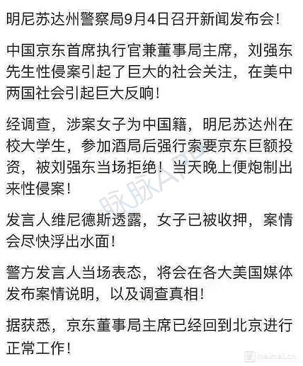 据明尼阿波利斯警察局新闻办公室发言人John Elder介绍,刘强东涉性侵案最早要到本周末才会有最新消息,目前尚不能确定其是否会被起诉。John Elder表示,如果刘强东被起诉,也只涉及民事诉讼,与刑事诉讼无关。