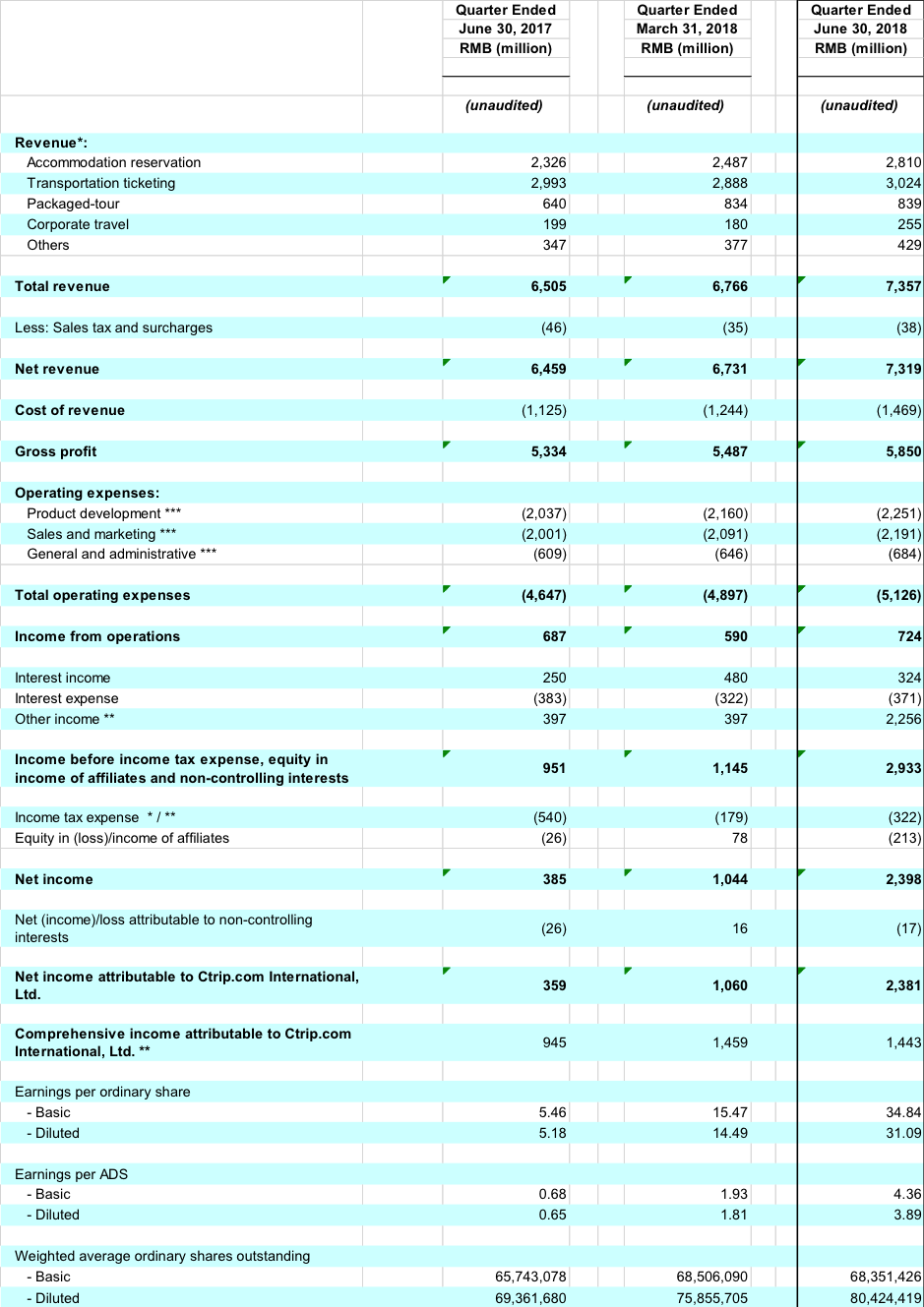 携程2018年第二季度收入为73亿人民币,同比增长13%;若不计股权报酬费用,2018年第二季度的营业利润率为16%,上季度为14%,运营有效性提高;2018年第二季度净利润为24亿元人民币,2017年同期为3.59亿人民币。公司预计三季度收入同比增长13%-18%。