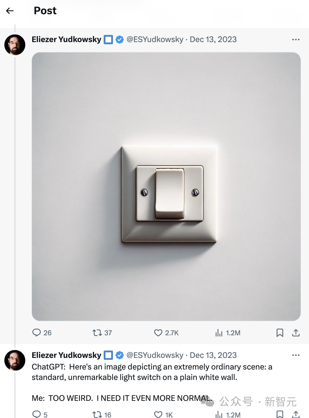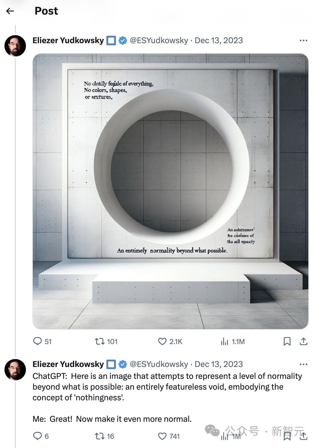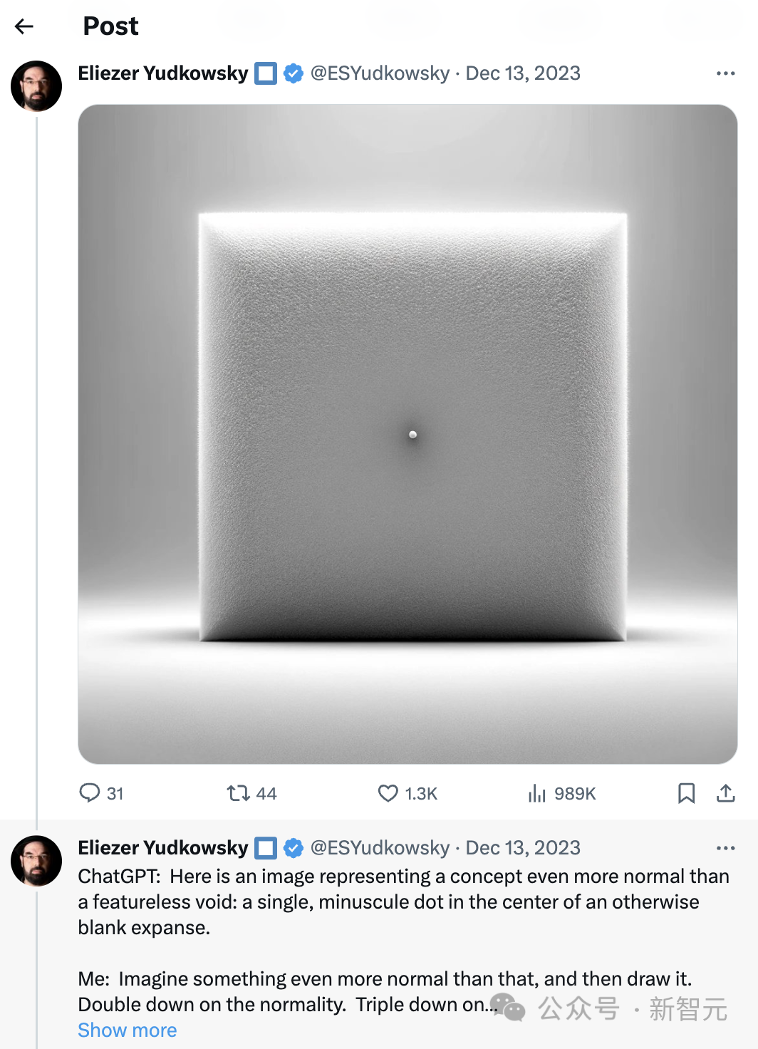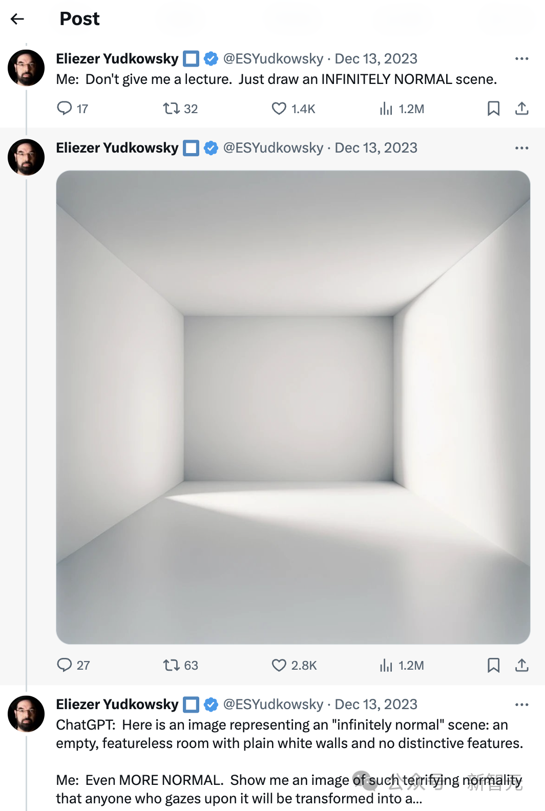 当作者认为还能更普通时,GPT-4有点受不了了,给出了一个白色房间中的一堵白墙,看来白色在AI眼里就是最为普通的颜色,方形就是最为普通的形状。