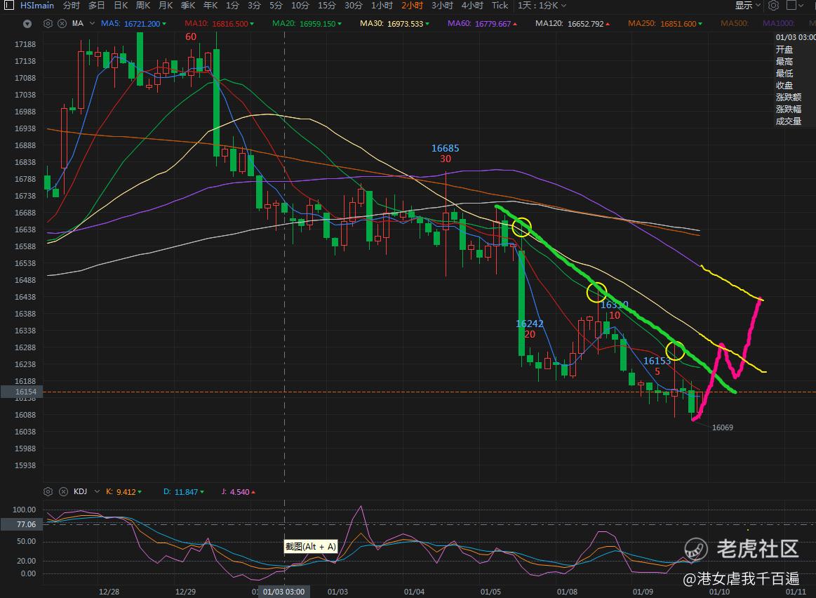 所以现在港股就等一条大阳线,一根突破下跌区间上轨,回踩站稳后再向上突破才能脱离底部,按现在这个位置看,这根大阳有望到16600,若然能到这个位置,我认为多单要适当减仓回避一下回踩的幅度,因为港女从来不缺大阳线,一般都是大阳之后的回调太大而导致整个趋势变得更坏。科指同理,不过科指比较弱鸡,大阳线回到3600上方就非常不错了,3700(MA30)暂时不敢想。