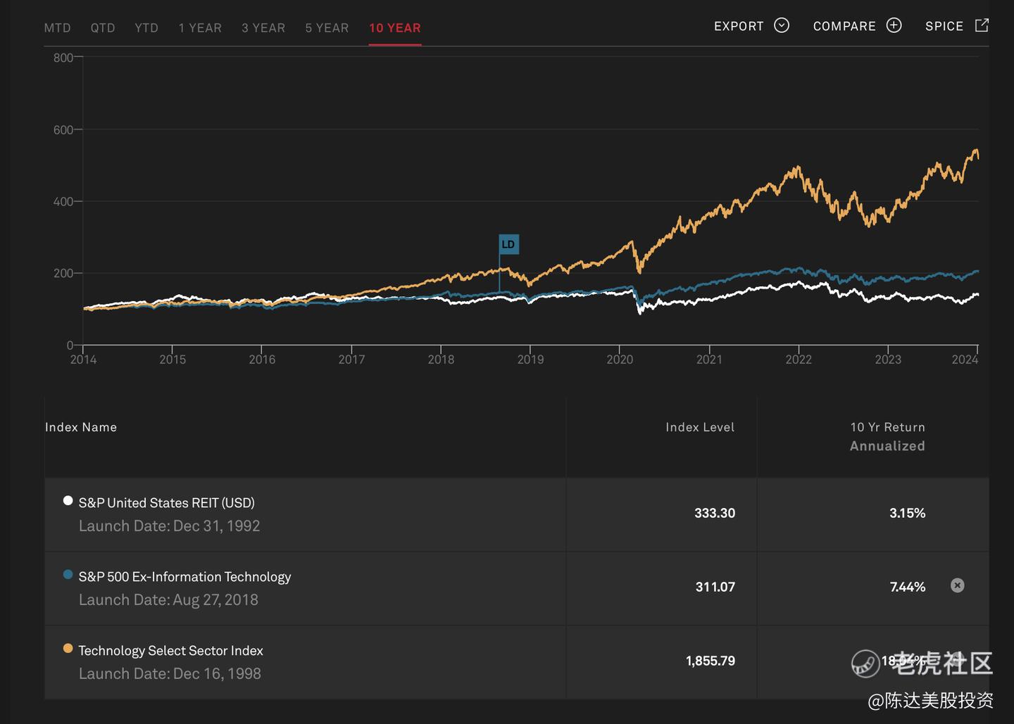 下面这个十年收益图就很能说明,如果不配置科技,你基本就做不好美股。白线是标普房地产信托指数(REITs),蓝线是标普500去掉科技股的走势,黄线是标普科技板块。它们十年里的年化回报分别是 3.15%、7.44%、18.04%(当然公平地讲,REITs股价回报低,但分红比较高)。如果选错了行业板块,不同beta下投资的难度系数大相径庭,有些会难到变态。