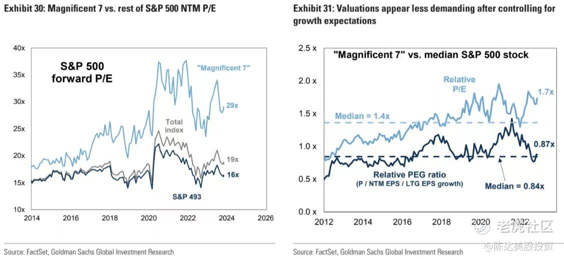 左图,美股科技七龙珠的forward 市盈率与标普剩下493家以及大盘指数的市盈率对比。七龙珠 forward PE很高;但右图,七龙珠如果以PEG加入成长性考虑,估值会合理很多:
