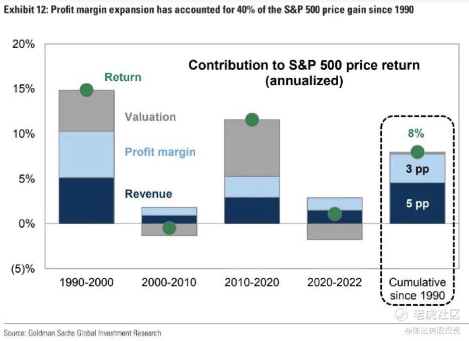 比如下图研究,拆解了标普500的长期回报,结论是美股真实业绩——包括收入增长与利润率提升——可以解释标普500从1990年以来的上涨里50%以上的回报。见下图: