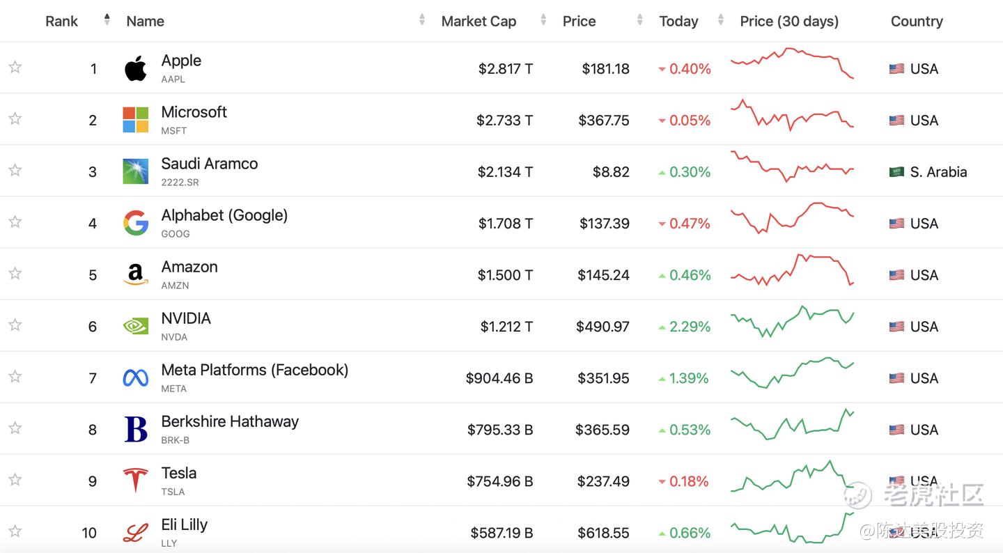 如果全球股市是一个统一大市场,我们就叫他蓝星综合指数吧,那么这个市场权重最大的几个大盘股,是各自将近3万亿美元市值的苹果和微软,是紧随其后的谷歌、亚马逊、英伟达、Meta、特斯拉;我们熟悉的A股或港股的最大盘公司,是排在第23的腾讯和第28的茅台。A股的大盘股,我们放在蓝星综合指数里,那就都是小盘股。