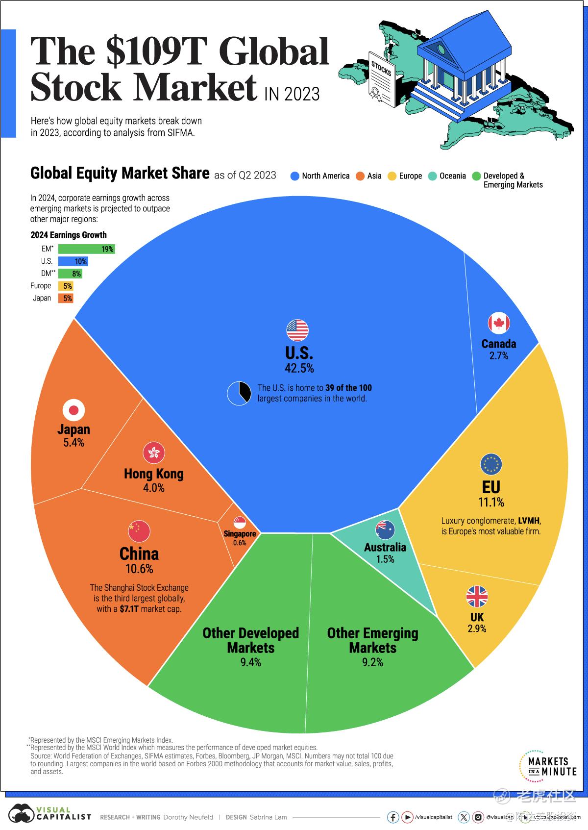 蓝星综合指数,全部加起来的市值大概是110万亿美元左右,截止2Q23,美股占比42.5%,欧股占比11.1%,A股占10.6%,港股4%,还有日股、英股等等,如下图所示。鉴于从2023年中到现在港A与美股此消彼长,美股的占比应该更高,在冲一半的路上没有一丁点悬崖勒马的意思。而图中说全球市值最大的100家公司里39家是美国公司,已经过时了,我去数了数,现在是61家。全世界市值最高的100家公司,有61家美资。