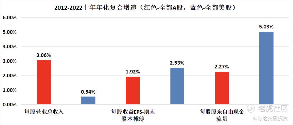 下图可以看到美股的盈利能力,尽管美股收入增速不如A股(这与我们GDP增速相匹配),但是净利润与自由现金流反而年化增长远高于后者。