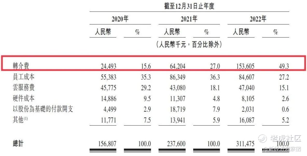 庞大的代理队伍直接拉高了百望云的销售成本。2020-2022年,公司转介费高达0.24亿元、0.64亿元、1.54亿元,占比销售成本的15.6%、27.0%、49.3%。可以看出,转介费猛增,的确是拖累公司亏损的主要来源。