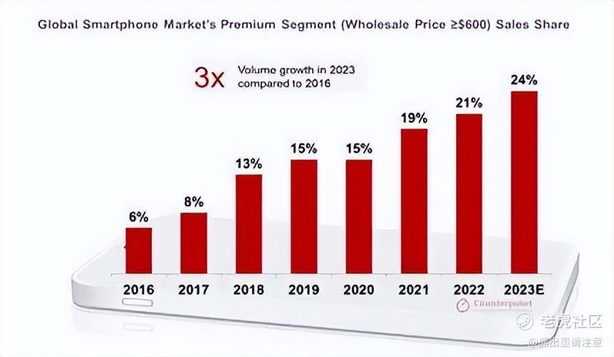 Counterpoint报告指出,相比2016年,2023年的高端手机市场空间提升三倍。具体来看,2023年高端手机(批发价≥600美元)市场的销售额同比增长6%,创下新纪录。1000美元以上的超高端手机占据了高端市场总销售额的三分之一以上。