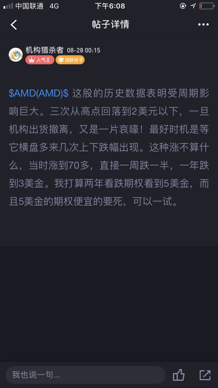 $AMD(AMD)$一堆人是不是以为AMD只是在和Intel竞争做CPU,不知道微软和索尼投了很多钱给AMD研究下一代的游戏主机吗?这样AMD都不是价值投资,哪家公司算价值投资?我记得某人还说23.7空的,不知道空没空