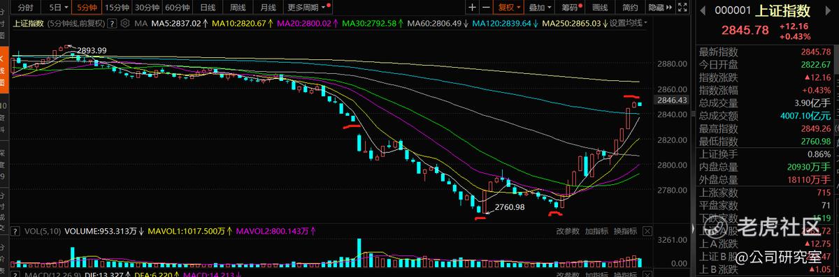 以沪指为例,股指最低点在上午11点1刻后出现,最低触及2760.98点, 跌幅超2.5%。午后开盘,股指继续回落,1点50前后创出盘中次低2764.25点,随后一路震荡上扬;收盘前5分钟,盘中创出当日高点2849.26,最后收报2845.78点,较前一交易日上涨0.43%。 当日,沪市成交4007.1亿元,深市成交4640,8亿元,双双创出进入2024年以来的新高,合计8647.9亿。