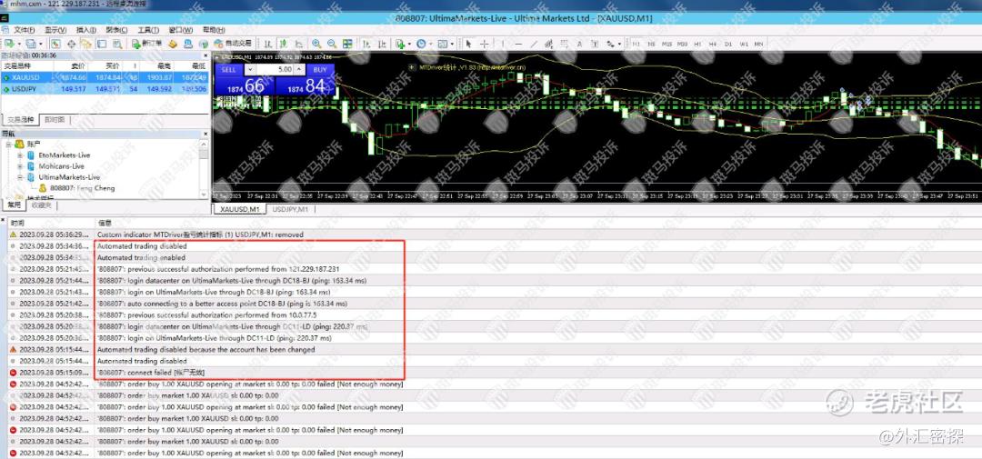 经A先生查明,原来自己使用的交易平台UltimaMarkets(UM交易账户MT4:808807),在没有经过客户同意的情况下,半夜里随意更改客户MT4交易密码,导致A先生的EA无法正常运行,最终账户亏损2000美金。