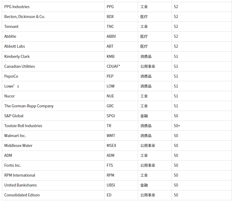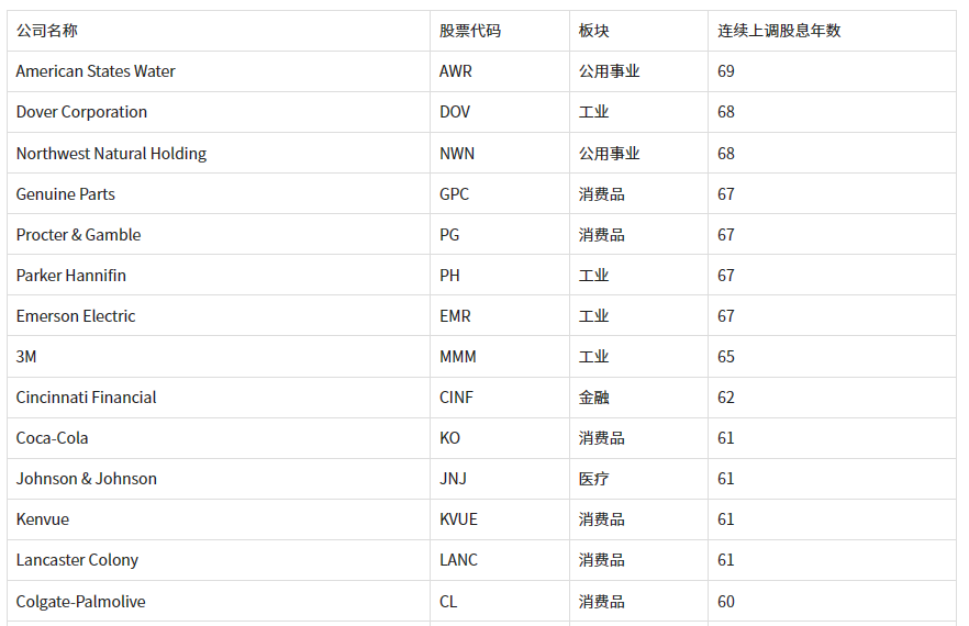 长期派息增长:股息王是指连续至少50年每年增加其股息支付的上市公司。这代表了极其稀有和持久的特征,表明这些公司具备稳定的财务实力和长期增长潜力。